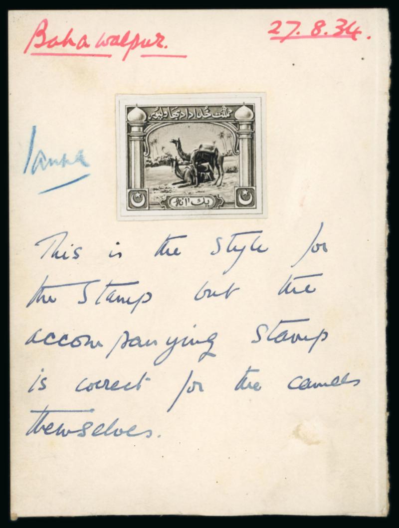 1933 Photographic essay of an unadopted postage stamp (later used for a revenue stamp) depicting camels, mounted on card and dated "27.8.34" and annotated "1 anna", as well as a colour palette card for each value from 1/2a to 10R with the intended design. Very rare and probably unique archival material. Ex. Robson Lowe 10 Sep 1976 lot 2132 (Image)