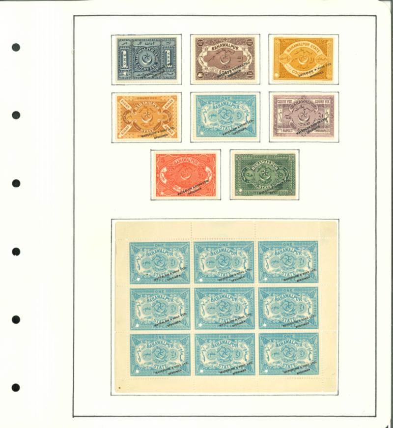 1947-49 Bahawalpur collection complete representation on pages. Starts with court fee set and a sheet all overprinted "Waterlow & Sons Ltd, SPECIMEN" (scarce, archival material). All stamps of the state from first issues, portrait issues and UPU sets and also service overprints in red and black. Very fine (SG £1200+). (Image)