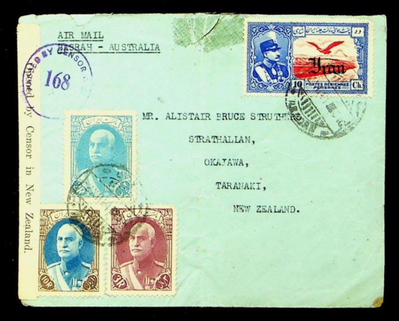 Iran ovpt on Persia 10ch 1941 WWII censored airmail cover from Basrah via Australia to Okaiawa New Zealand (Image)