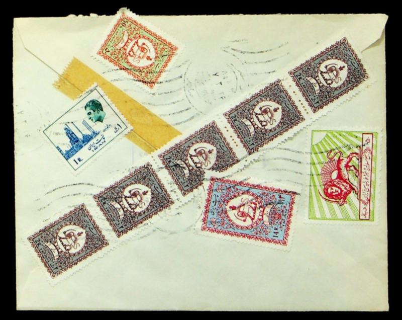 Iran 2r strip of 5+ 3v w/ Lion label franked at back of cover written in native scrip (Image)