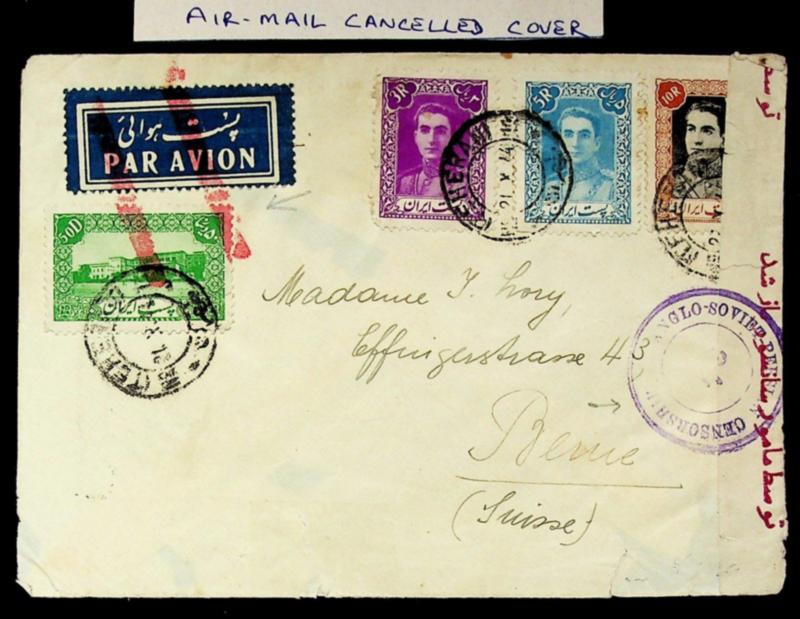 Iran 1944 WWII 4v on censored airmail cancelled w/ red bars cover from Tehran to Bern Switzerland (Image)