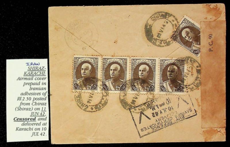 Iran 1942 WWII 50dx5 on censored airmail cover from Shiraz to Karachi India (Image)