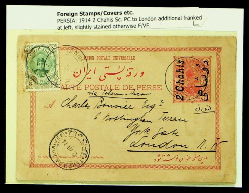 Persia 1914 2 Chahis s/c UPU postcard uprated w/ 3ch via Teheran to London England (Image)