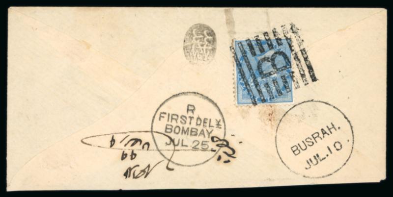 Bagdad group of five envelopes to Bombay, two single 1/2a and a pair, plus two registered with two 2a or larger envelope pair of 1a and a 4a., two Busrah covers bearing half anna frankings (Image)