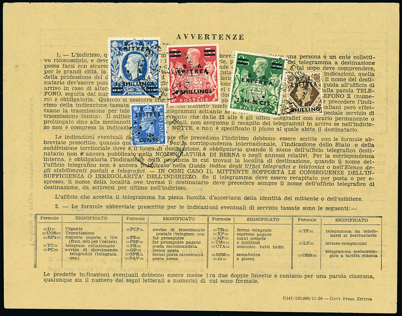 British Occupation of Italian Colonies: Eritrea: 1951, a group of nine telegrams bearing values to 10s. on 10s., all perfined "Pagato", sent from Asmara (7), Massaua and Assab. (9) Photo. (Image1)