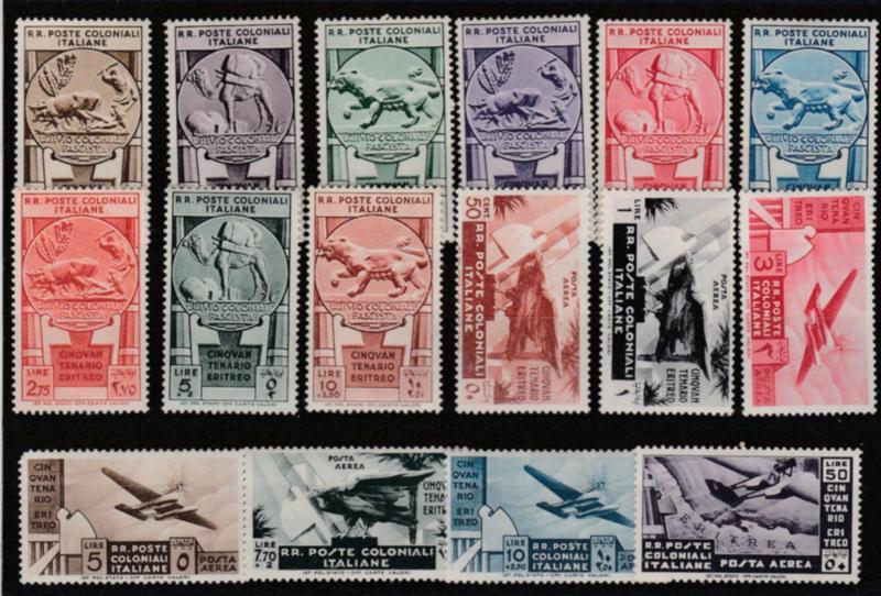 Colonie Italiane - Emissioni Generali. 1933 - Cinquantenario Eritreo, n. 23/31+A15/A21. Cat. € 1200,00 (Image)