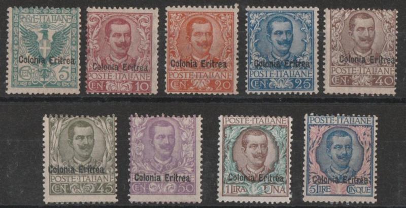 Colonie Italiane - Eritrea. 1903 - F.lli d’ Italia soprastampati Colonia Eritrea n. 19/29. Cert. Biondi. Cat. € 4500,00. SPL (Image)
