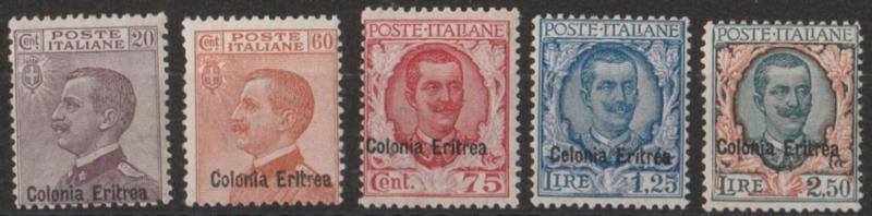 Colonie Italiane - Eritrea. 1928-29 - Francobolli d’Italia soprastampati n. 123/27. Cert. Biondi. Cat. € 2750,00. SPL (Image)