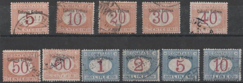 Colonie Italiane - Eritrea. 1903 - Segnatasse - Soprastampati “ERITREA” n. 1/11. Cert. E. Diena. Cat. € 2450,00. SPL (Image)