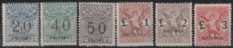 Colonie Italiane - Eritrea. 1924 - Segnatasse Vaglia - Soprastampati “ERITREA” n. 1/6. Cert. R. Diena. Cat. € 1200,00. SPL (Image)