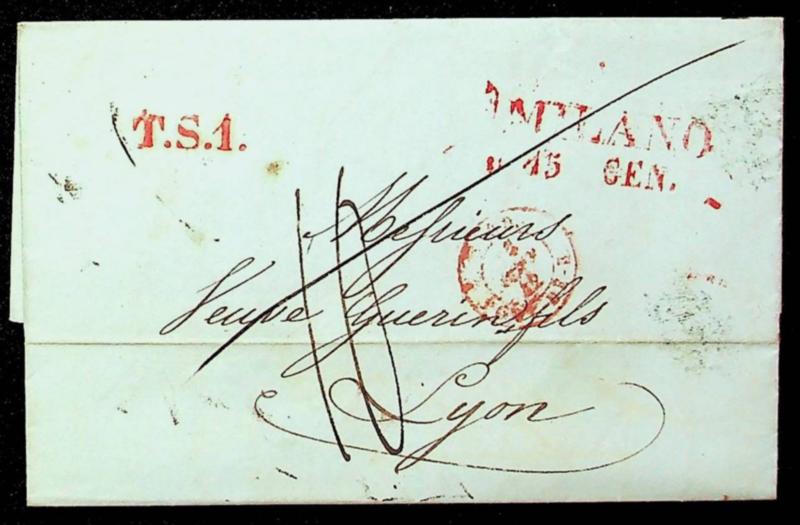 Italy 1842 early Prestamp cover w/letter + cachet from Milan to Lyon France (Image)
