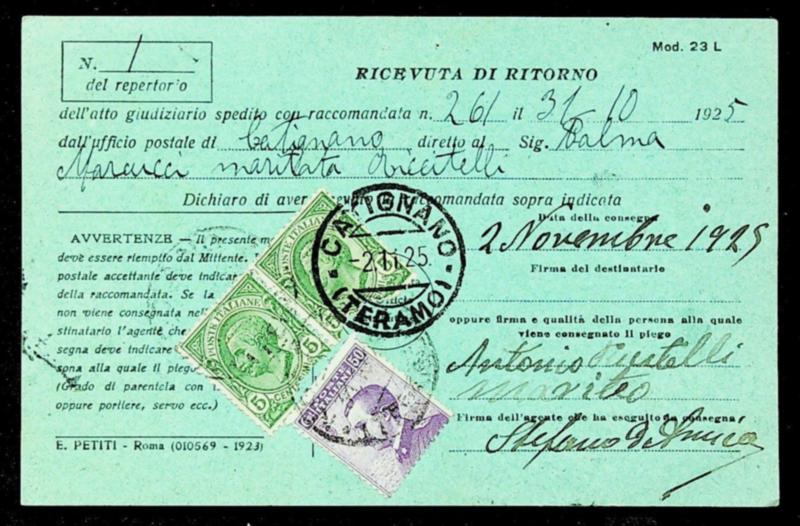 Italy 1925 50c+ 5c pair on Regd Return Receipt card from Catignano, Terama (Image)