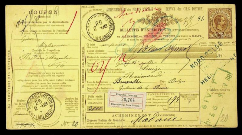 Italy 1888 Victor Emmanuel II 1.75L parcel card from Genova to Brussels Belgium (Image)