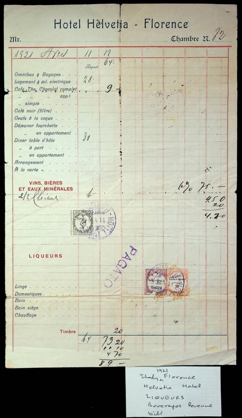 Italy 1921 Hotel Helvetia, Florence Revenue Bill franked w/ 3v (Image)