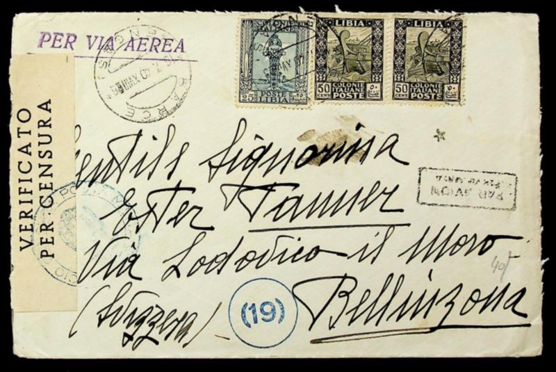 Italian colonies Libya 1940 WWII, censored airmail cover from Benghazi to Bellinzona Switzerland (Image)