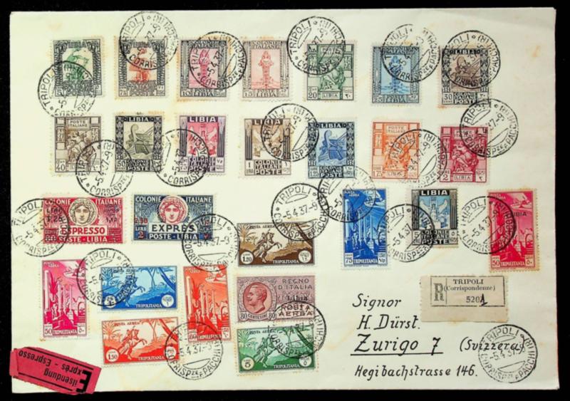 Italian Libia 1937 26v on Regd Express cover from Tripoli to Zurich Switzerland (Image)