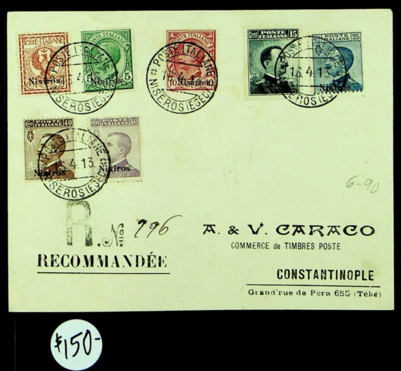 Italy Occ. Greece 1913 Nisiros ovpt 7v on regd cover to Galata Turkey (Image)