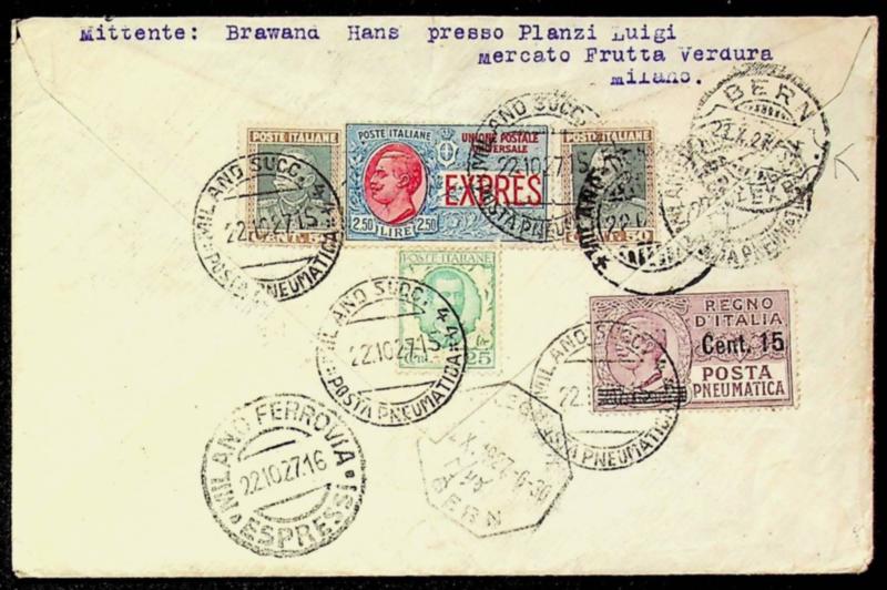 Italy 1927 5v franked at back of Express cover from Milano to Bern Switzerland (Image)