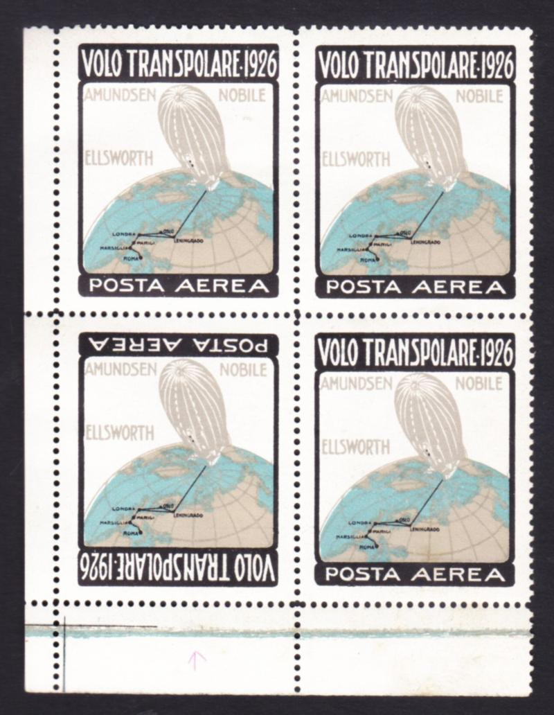 Italy 1926 Airmail Amundsen-Nobile-Ellsworth Trans-Polar Flight corner block of 4 unused center inverted error variety stamps (Image)