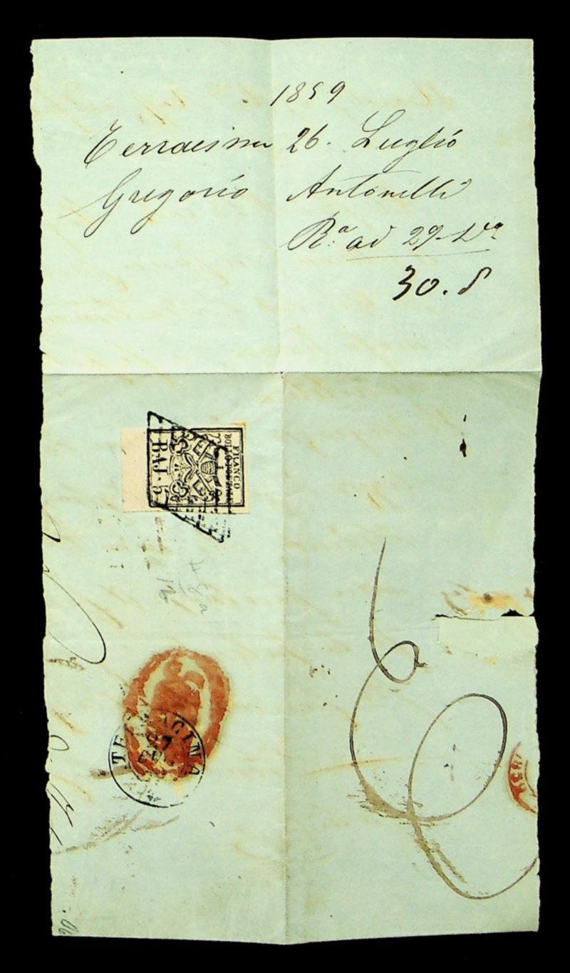 Italy Roman States 1859 Papal Arms 5 Baj black on rose Imperf on part cover from Terracina (Image)