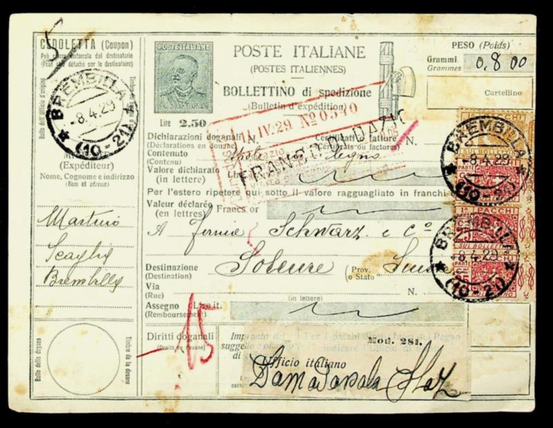 Italy 1929 4v pacchi vals uprated parcel card from Brembilla to Solothurn Switzerland (Image)