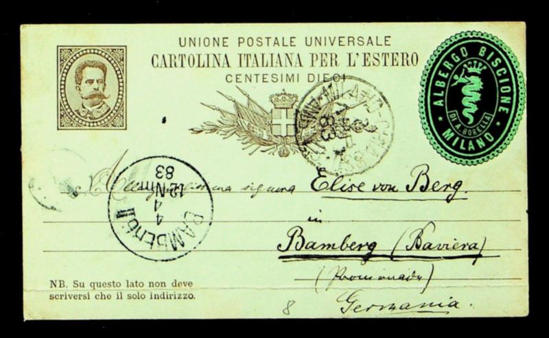 Italy 1883 King Umberto I 10c postcard w/ green/ black seal from Milano to Bamberg Germany (Image)