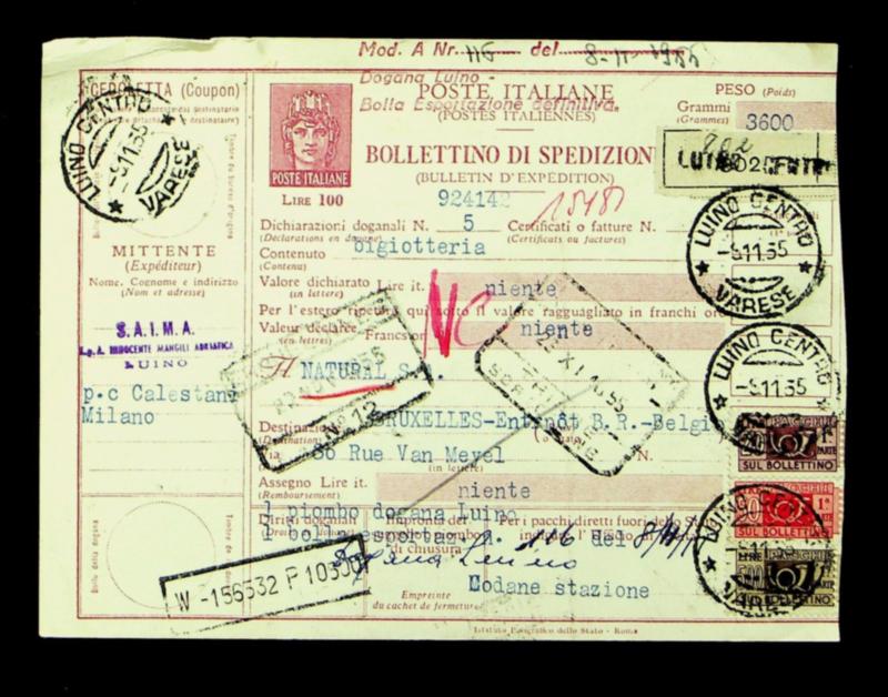 Italy 1955 3v on 100 lire parcel card from Luino to Brussels Belgium (Image)