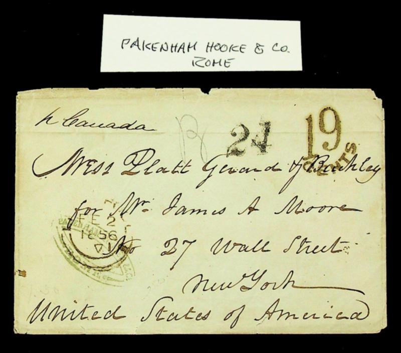 Italy 1856 stampless cover w/ "19c" charge mark & "PAKENHAM HOOKE & Co. ROME" Forwarding Agent's seal to New York USA (Image)