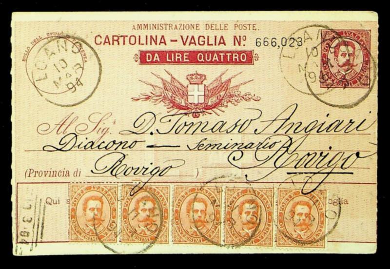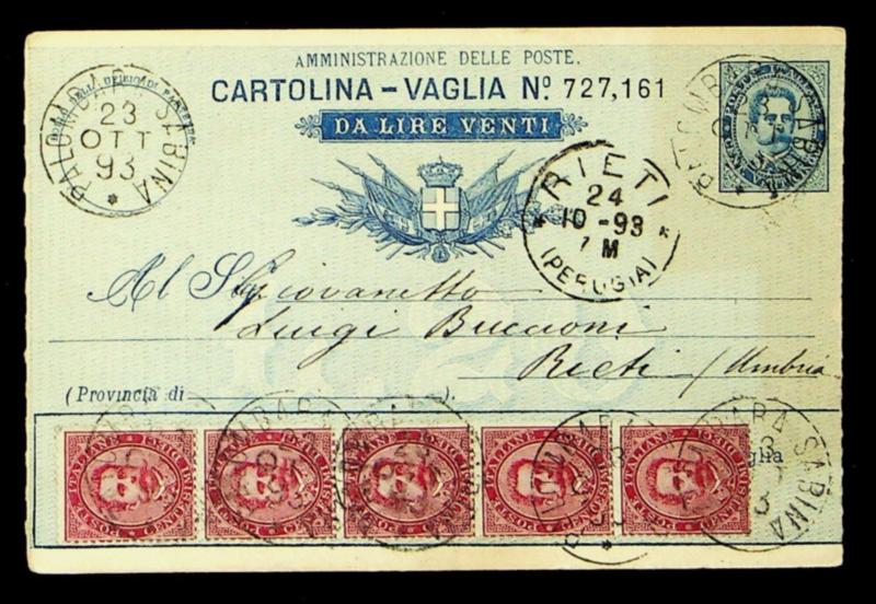 Italy 1893 King Umberto I 20c Money Order card uprated w/ 10cx5 from Palombara-Sabina to Rieti (Image)