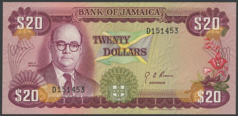 1976 $10 blue-black P62 (Unc); and $20 maroon P63 (light centrefold, EF).