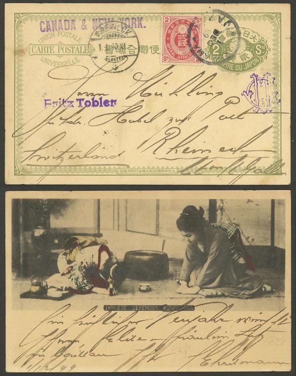 2s. Postal card illustrated on back with view of "Japanese Ceremony - Konichiwa" + additional postage of 2c., sent from Yokohama to Switzerland on 1/DE/1899 (arrival 1/JA/1900), VF quality, very nice! (Image)