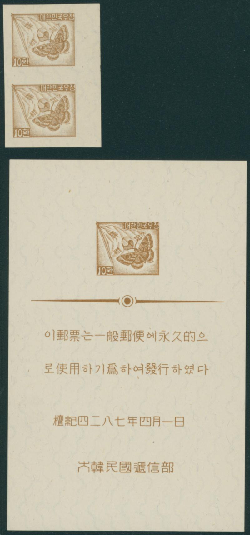 South Korea 1954 10hw Presentation Sheet and an Imperf Pair unused (Image1)