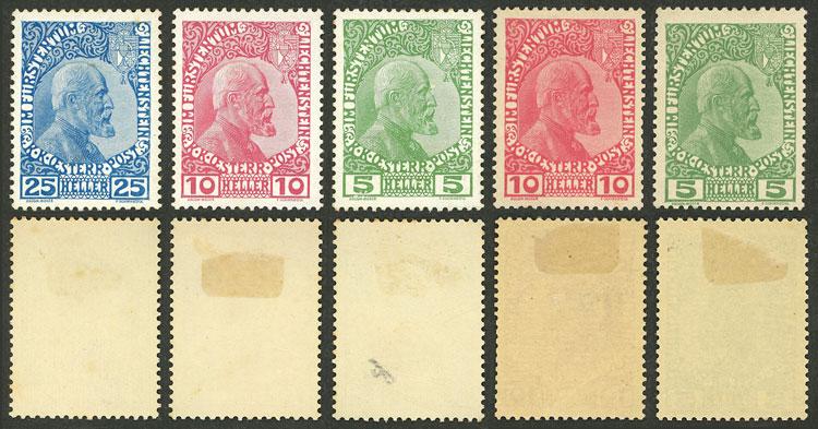 Sc.1/3 + 1a + 2a, 1912 the set of 3 values on chalky paper + 2 stamps printed on unsurfaced paper, mint with gum (with minor gum defects), very fine appearance, catalog value US$310 (Image)