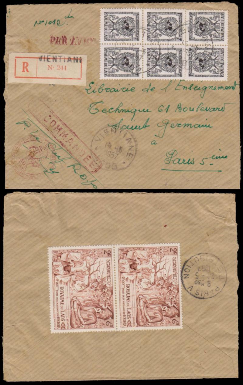 Laos 1957 1k block of 6+ 2k pair franked on both sides of Regd airmail cover from Vientiane to Paris France (Image)