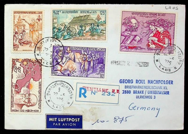 Laos 1975 5v on Regd airmail cover from Vientiane to Germany (Image)
