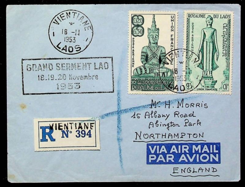 Laos 1953 2v on Regd airmail cover from Vientiane to Northampton England (Image)