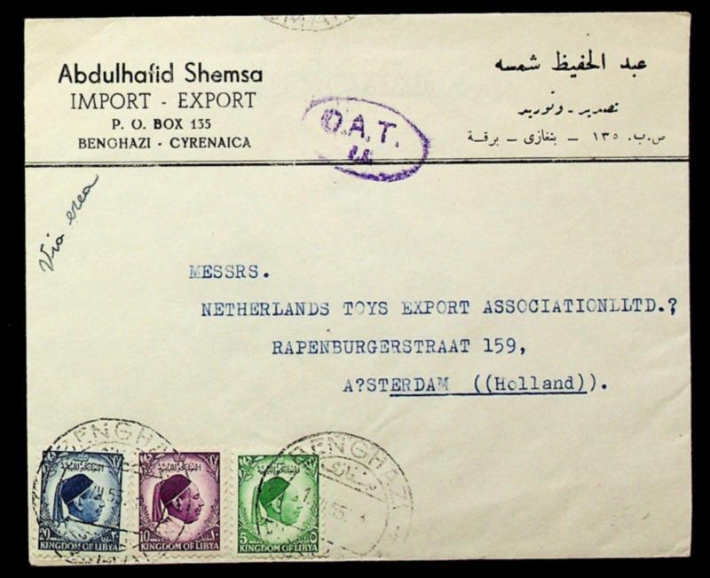 Libya 1955 3v on airmail cover from Benghazi w/ oval "OAT/ FS" cachet in violet to Amsterdam Netherlands (Image)