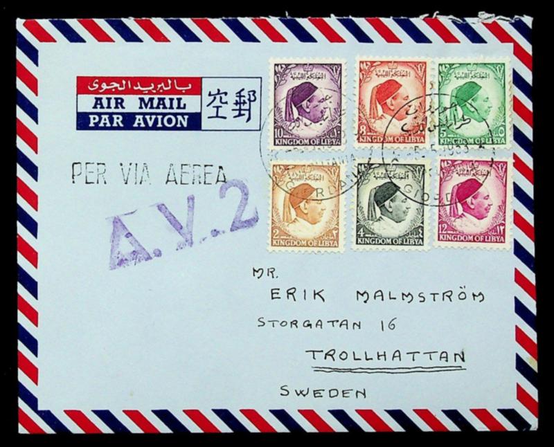 Libya 1953 6v on airmail cover w/ "AV2" cachet in violet from Giordani to Sweden (Image)