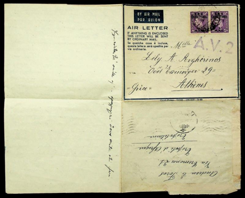 Libya "BMA Tripolitania" ovpt on GB KGVI 3dx2 1949 airmail Air Letter w/ "AV2" cachet in violet to Athens Greece (Image)