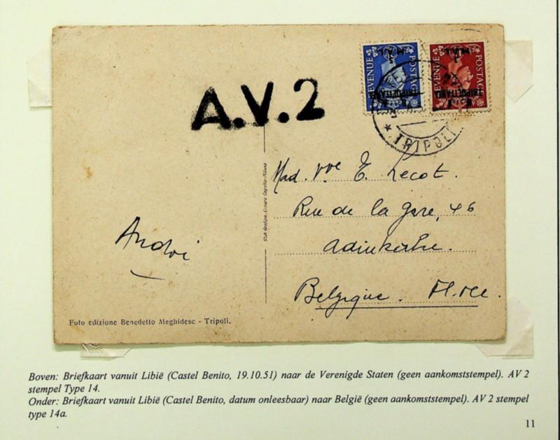 Libya "BA Tripolitania" ovpt on GB KGVI 2v on Tripoli, Waterfront Gardens PPC w/ "AV2" cachet in black to Belgium (Image)