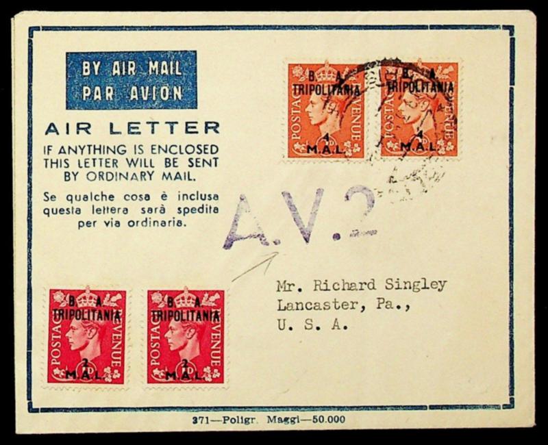 Libya "BA Tripolitania" ovpt on GB KGVI 4v on airmail Air Letter w/ "AV2" cachet in violet to Lancaster Pa. USA (Image)