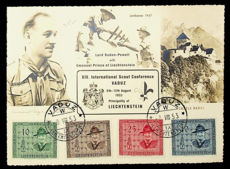 Liechtenstein 1953 14th International Scout Conference Vaduz/ Lord Baden-Powell w/ Emanuel Prince Maxim card w/ 4v (Image)