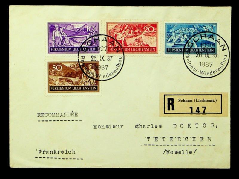 Liechtenstein 1937 Labour 4v on Regd cover from Schaan to Teterchen Moselle France (Image)