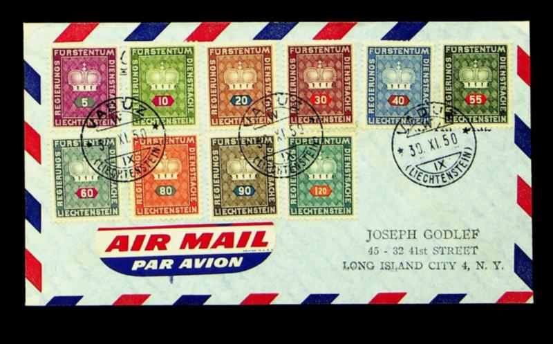 Liechtenstein 1950 Officials 10c on airmail cover from Vaduz to Long Island City NY USA (Image)