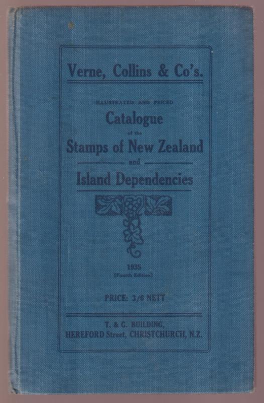 Verne Collins & Co's illustrated & Priced Catalogue of the Stamps of New Zealand & Island Dependencies, 1935 (4th edn), hard cover. Some eye-watering prices noted, eg 1931 Health 1/8d per set, 1913 12/6d purple QVLT 25/- Mint, 10/- used! Pioneering catalogue. Fine. (Image)