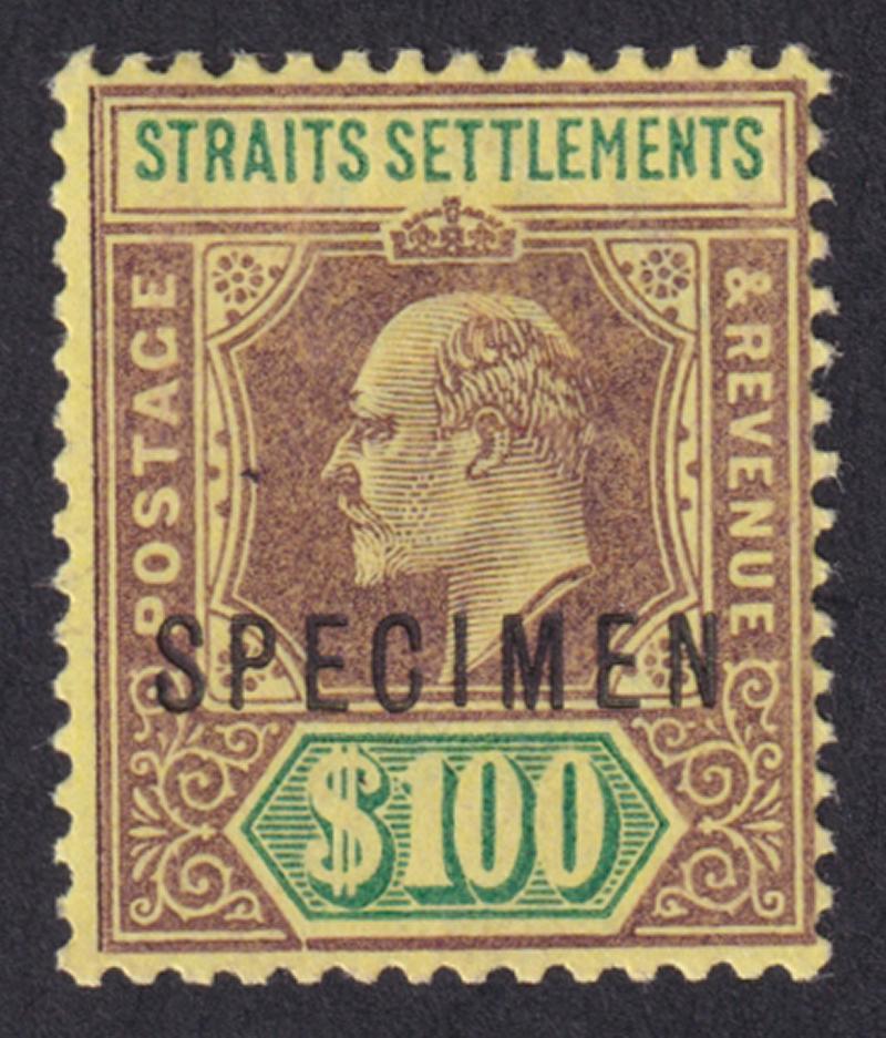 STRAITS SETTLEMENTS: 1904-10 KEVII $100 purple & green/yellow with 'SPECIMEN' Overprint SG 140s, very fresh, Cat £450. (Image1)
