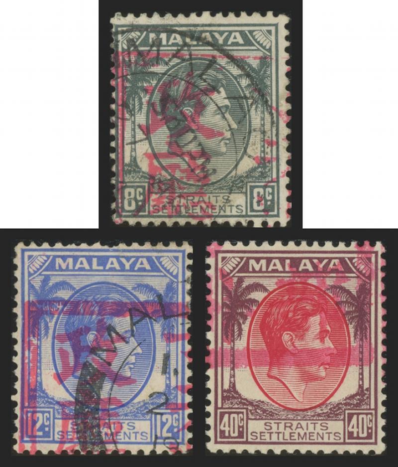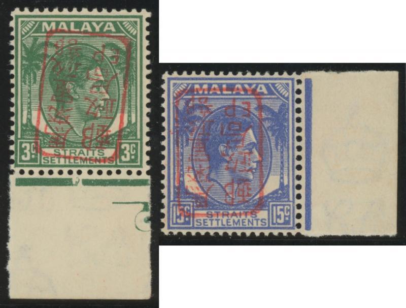 JAPANESE OCCUPATION: 1942 Singapore Type 16 Double-Frame Boxed Handstamp in Red on Straits Settlements KGVI 1c to 15c set SG J92-J96 plus an extra 3c, also General Issues Type 1 Single-Frame Boxed Handstamp in Black on Straits Settlements KGVI 2c orange and Handstamp in Red on Straits Settlements KGVI 1c black, 5c brown, 8c grey, 10c purple & 12c blue plus Handstamp Inverted on 3c green & on 15c blue (both unlisted by Gibbons; ISC J16d & J21d, Cat RM$1300) marginal examples unmounted, the others mostly with hinge remainders and characteristic tropicalised gum, Cat £650 for those listed unmounted. None are expertised, so must be offered strictly 'as is'.