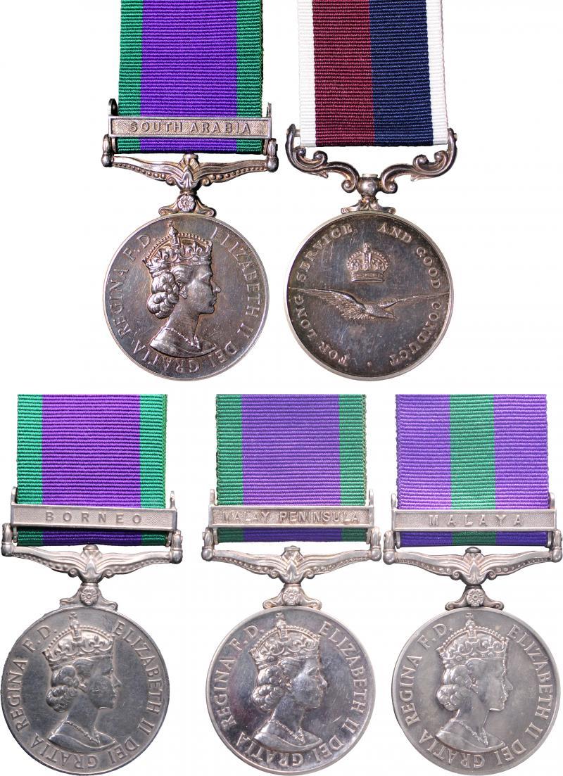 GREAT BRITAIN: Collection with General Service Medals (3 singles and pair) comprising '21141646 RFN. GHAMBIR PUN 1/6 GR.' 1/6 Gurkha Rifles with 'BORNEO' clasp; 'A4004722 CPL. K.I. TOWNSON. R.A.F.' Royal Airforce with 'MALAY PENNINSULA' clasp; '23645062 GNR. M.J. KENNEDY. R.A.' Royal Artillery with 'MALAYA' clasp; and GSM/RAF Long Service pair Type B Swivel Suspender awarded to and impressed 'J 4136225 A/CPL. (or CPL) D.L. LANGFORD. RAF' Royal Air Force GSM with 'SOUTH ARABIA' clasp; Volunteer Service Long Service Medal KEVII 'REX IMPERATOR' MY#232 awarded to and impressed '2628 GR: E. DAWSON. 4th W. RID: OF YORK RGA: VOLS:' 4th West Riding Battery Royal Garrison Artillery; and RAF Long Service and Good Conduct Medal QEII MY#268 Type C Non-Swivel Suspender awarded to and impressed '514596 CPL. R. MAXTON. R.A.F.'.