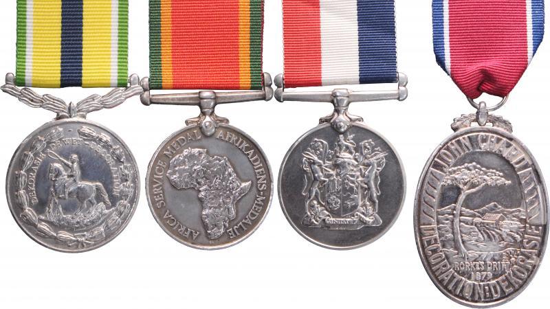 SOUTH AFRICA: Collection comprising Efficiency Medal KGVI MY #237 Type Aa 'UNION OF SOUTH AFRICA' bi-lingual scroll, awarded to 'S/SGT. J. B. TERRIS Q.S.C.' "Q" Service Corps (?); Rhodesia General Service for Whites and Blacks both named, Prison Service medals with Faithful Service silver & bronze, Gallantry & Long Service reproductions with miniatures; South Africa De Wet Decoration #'1898', 1943 African Service Medal named, 1946 War Medal, 1952 John Chard Decoration in silver and bronze, South Africa Medal reproduction, SADF (SWA/Angola) Pro-Patria, & General Service Medal; Police named trio Faithful Service, Faithful Service 30 years and 75th Anniversary.