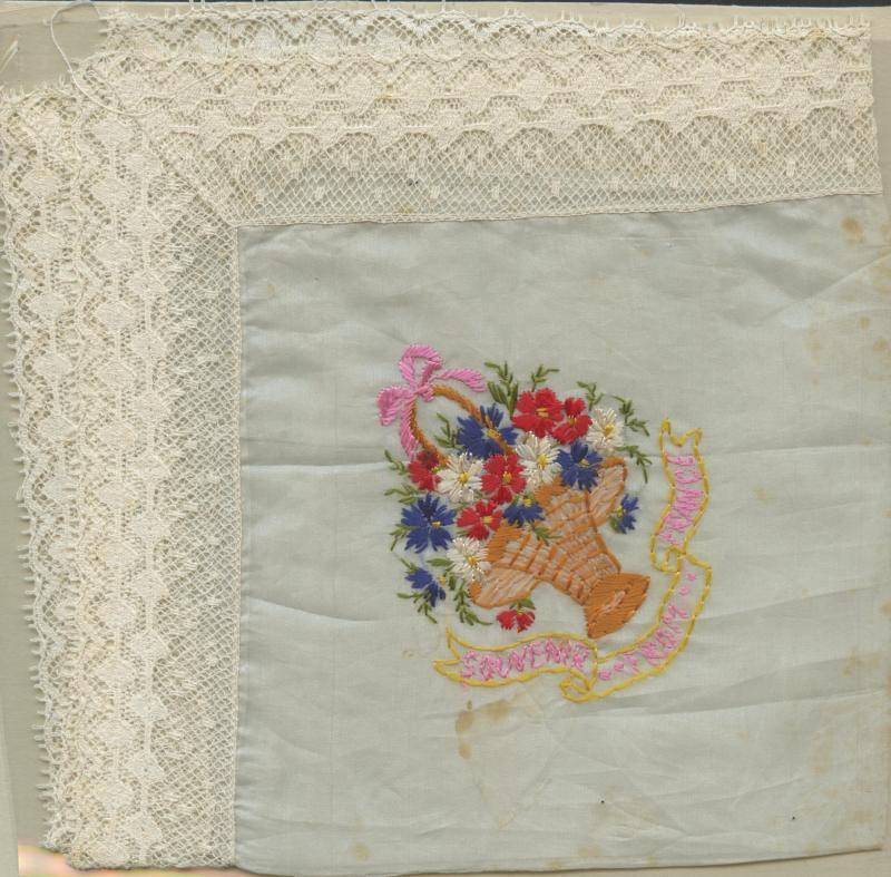 WWI Embroidered silk handkerchiefs from France with 'Australian Commonwealth Military Forces [Rising Sun]', 'Souvenir d Ypres [flags]', and 'Souvenir From France' x3 different, a few with some light stains.